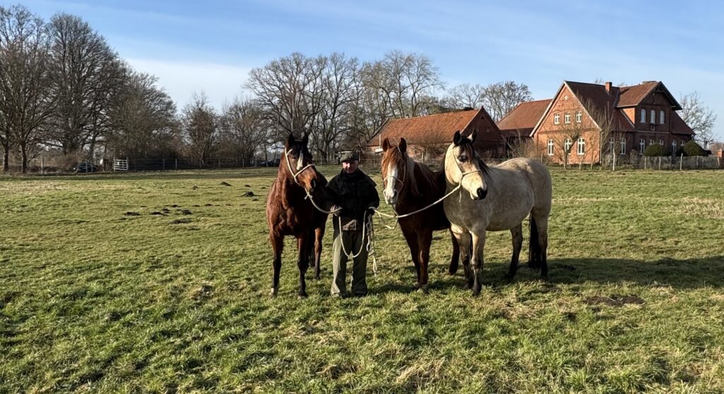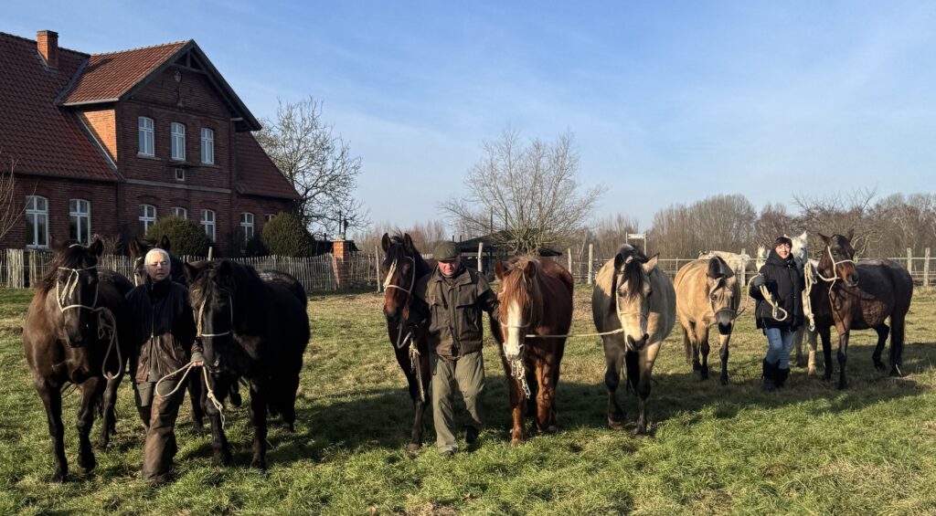Wir arbeiten mit einer Herde von momentan 18 Pferden. Die Pferderasse (Mangalarga Marchador, brasilianische Arbeitspferde) und die Art der Haltung, im Herdenverband ganzjährig draußen, sind die Voraussetzungen dafür, dass die Pferde „klar“ und pferdetypisch reagieren.